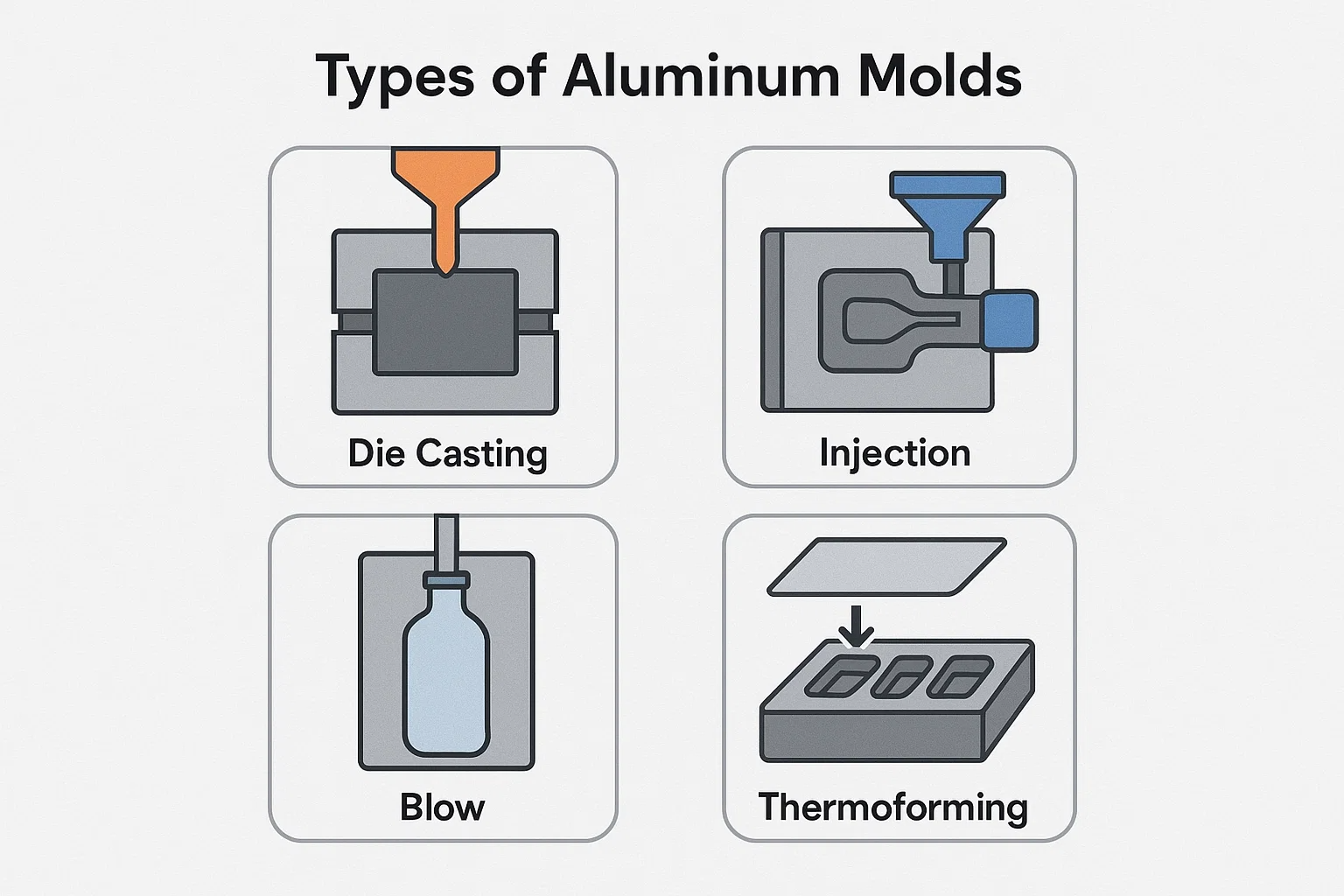 Thermoforming Fingit; Thermoforming est processus ubi a sheet of plastic calefacta usque ad plumbales, tunc afficiuntur vel pressed in fingunt. Vacuum est saepe applicari ad sugere in sheet in fingunt in Venustates. Aluminium scriptor excelsum scelerisque conductivity est crucial hic, ut permittit fingunt ut cito calor aut refrigescant plastic sheet, ensuring ultima pars tenet figura cum praecisione. Haec formae sunt communia in packaging, praesertim cibum et dolor bona.