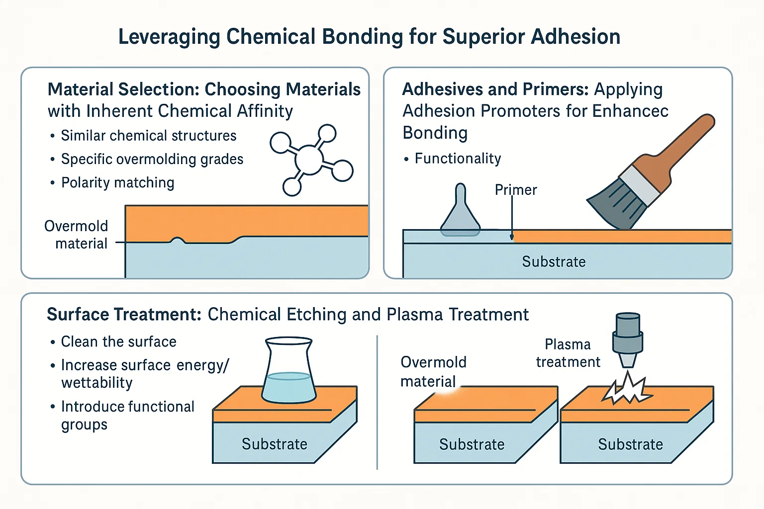 Chemical Priming / Adhaesionem promoters: Nam provocantes materiam combinationes, Promoters et adhaesionem primers potest applicari ad subiectum superficiem. Hae oeconomiae agere pontem, formatam vinculum cum subiecto et in overmold materia. Hoc est commune in Flexilis-ad-plastic aut metallum, ad-plastic overmolding.