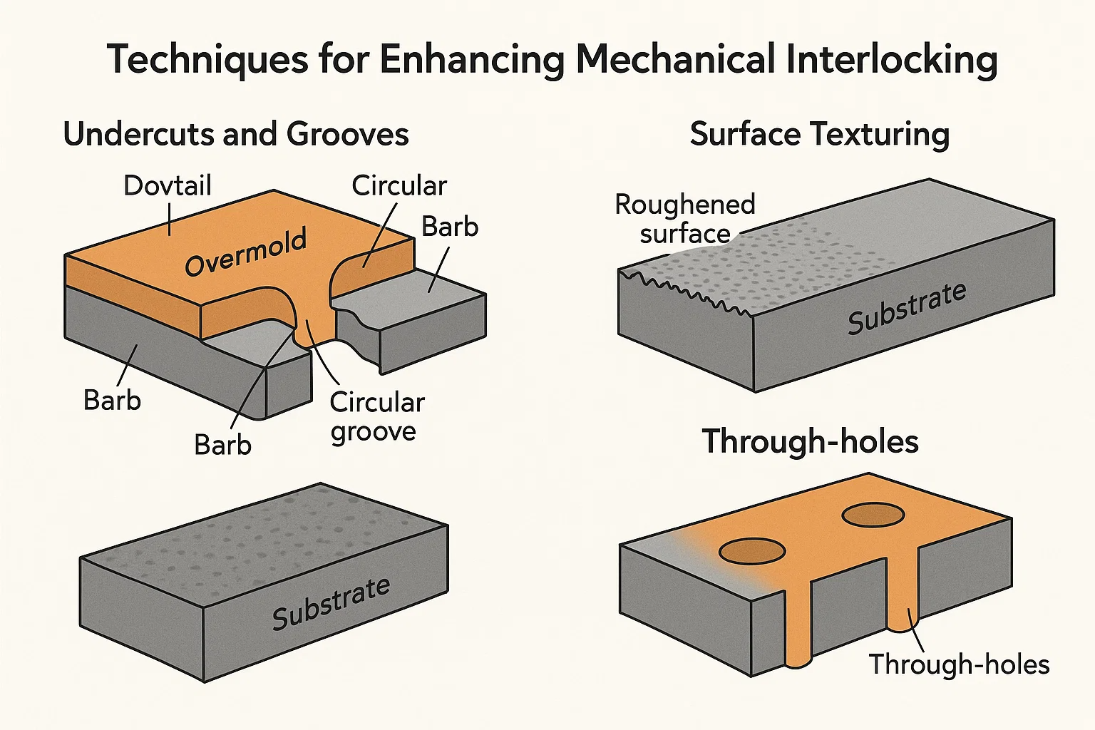 Mechanica interlocking providet fortis corporis anchoram chemical bonding Adhaesionem summum offert, creando virtualiter inseparabile interface inter substantiam et overmold materia. Hic modus innititur in ipsa m. commercium inter duas polymers, ducens ad vinculum, quod est saepe fortior quam cohaerentis robore vel materia.