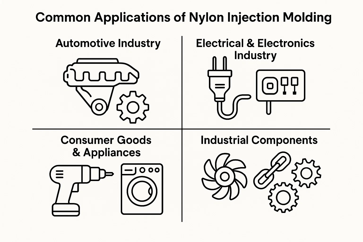 Sector autocineticus est unus e maximis sumptis nylon iniectionis effictae, praesertim gradibus confirmatis (PA6 et PA66 vitreis repletis), ubi effectus in ambitus caloris summus est essentialis.