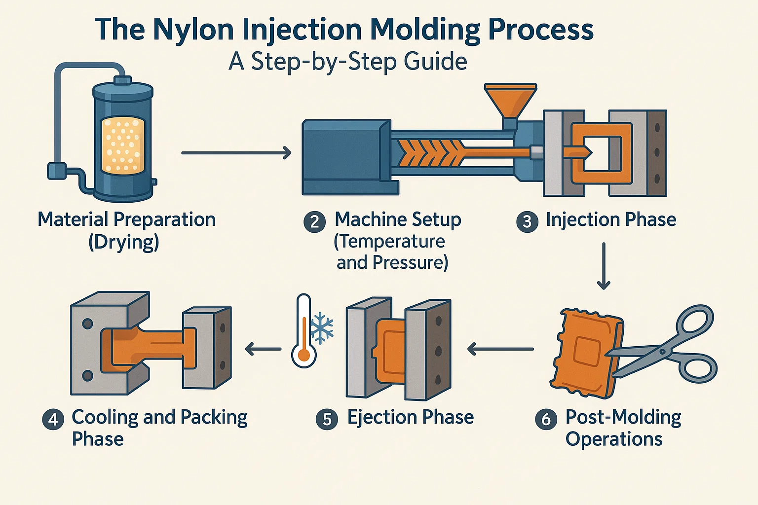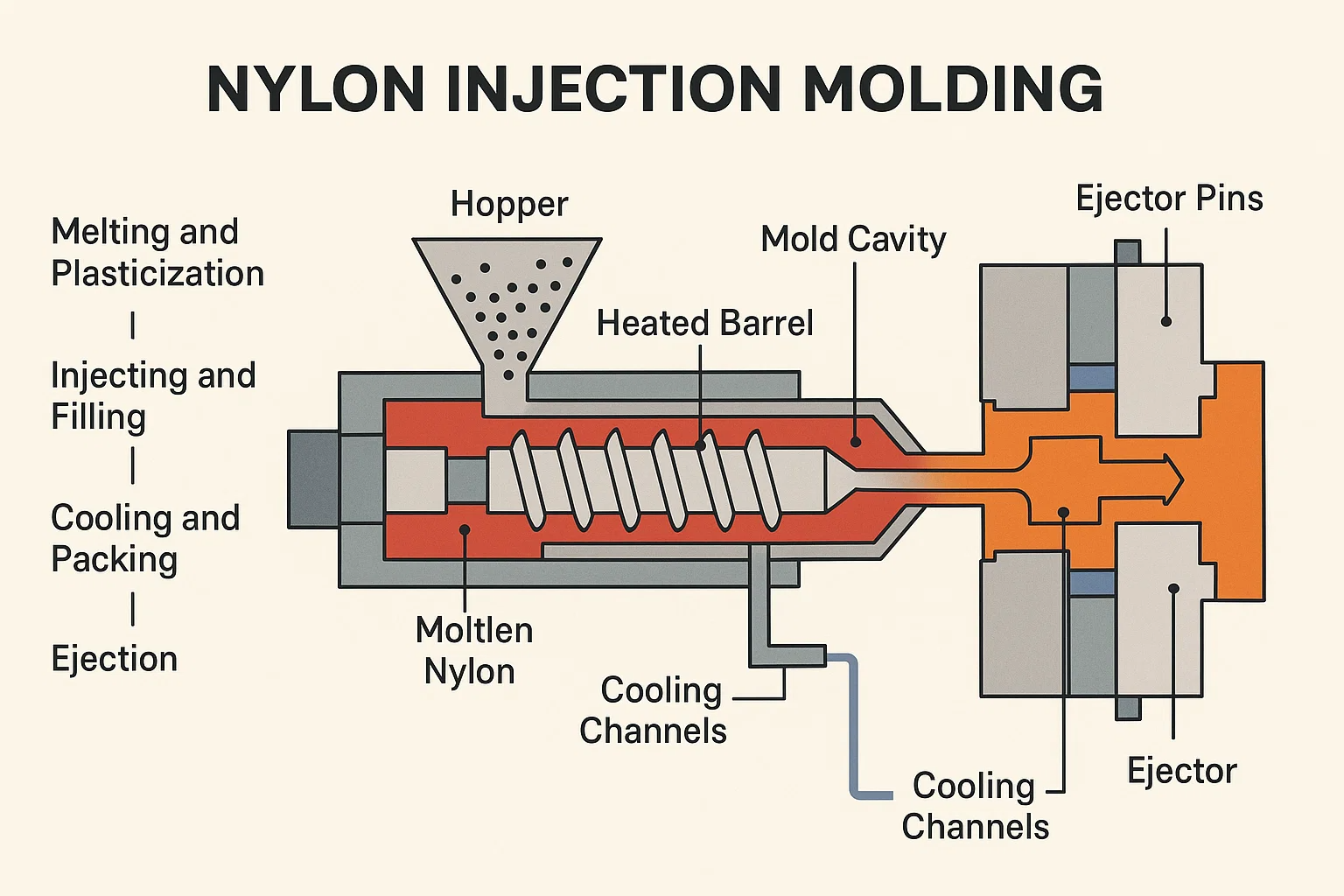 Processus fundamentaliter similis infusioni formarum aliarum materiarum materiarum, sed peculiarem attentionem requirit ad temperaturam, humorem imperium, et iniectionem pressionis ob singulares notas materiales nylon (specialiter suam altitudinem liquefactionis et naturae hygroscopicae).