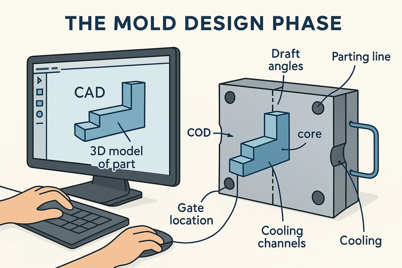 - Design fingunt circa partem : Semel ex parte se finalized, in focus vices ad designing fingunt quod producendum illud. Hoc involves creeto fingunt in variis components, comprehendo in core et cavum medietates, tum quod intricatus internum structurae quod facilitate coronam processus. Moderni CAD Software sodalizatus simulationes, praenuntiant quam plastic et fluunt et frigus in fingunt, auxilium ad identify potential proventus antequam aliqua corporalis vestibulum incipit.